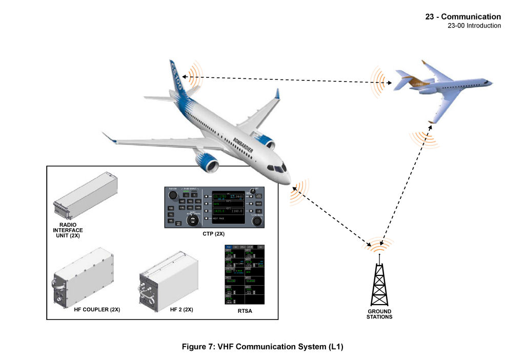 Each transceiver supports the 118.00 MHz to 136.975 MHz frequency range, with selectable 8.33 kHz or 25 kHz channel spacing. Tuning occurs through the pilot’s and copilot’s Control Tuning Panels (CTPs), which communicate with the aircraft’s Radio Interface Units (RIUs) and Data Concentrator Unit Module Cabinets (DMCs). Voice and data outputs pass through the Audio Control Panels (ACPs), ensuring that pilots can quickly select, monitor, or transmit on the desired VHF channel.
